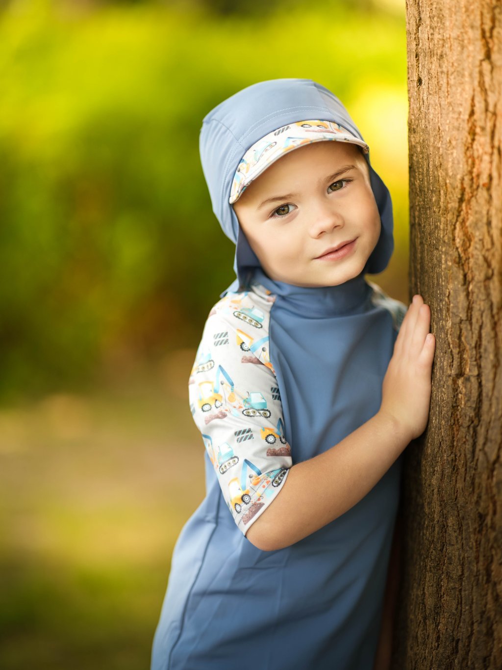 Kolekcia je vyrobená z kvalitnej talianskej flokovej tkaniny s UV ochranou 50+. Recyklovaný polyamid s certifikátom OEKO-TEX® zaručuje, že oblečenie je šetrné k životnému prostrediu a bezpečné pre detskú pokožku. Okrem toho je tento materiál rýchloschnúci, veľmi príjemný na dotyk a zaručuje maximálne pohodlie počas nosenia. Vďaka špeciálnej technológii pri výrobe materiálu je ochrana proti UV žiareniu trvalá a nevymýva sa ani po niekoľkých pracích cykloch.