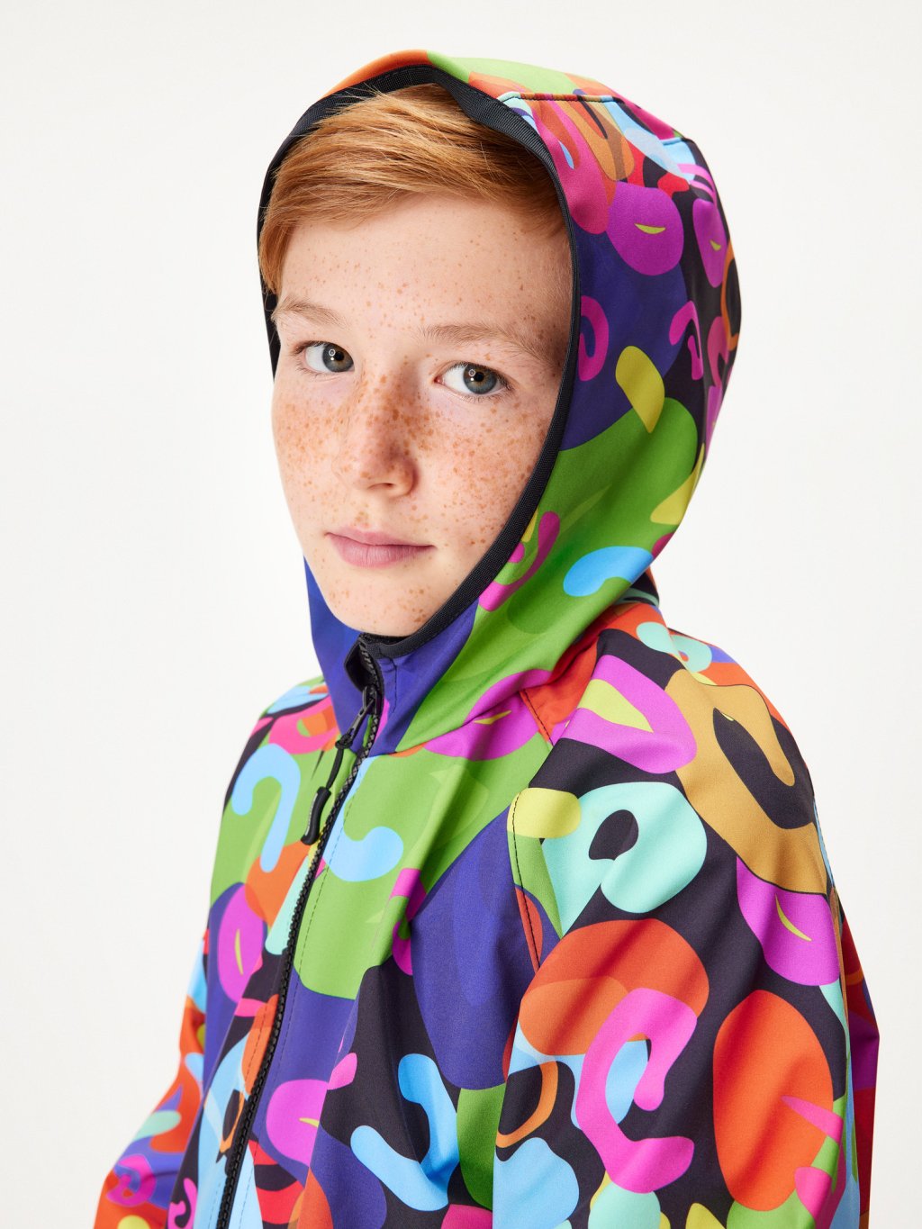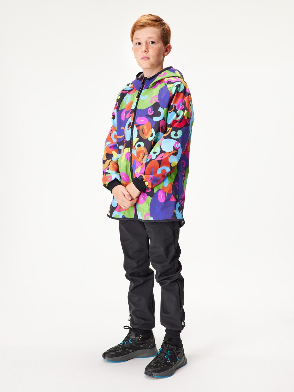 - hlavný materiál, potlač (softshell): rub, líc: 100% polyester, membrána: 100% polyuretan
