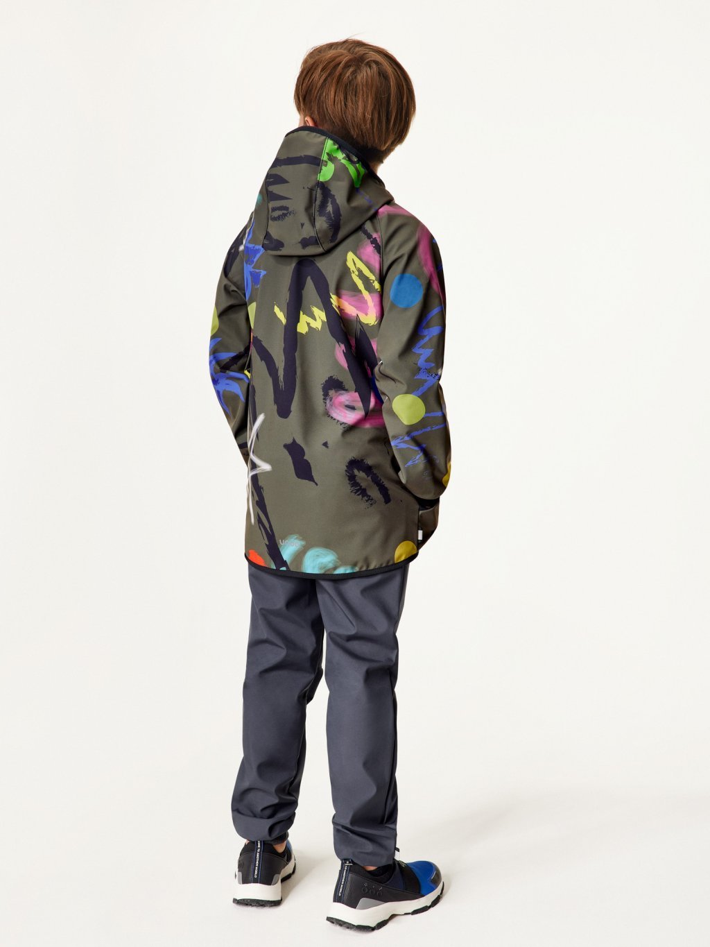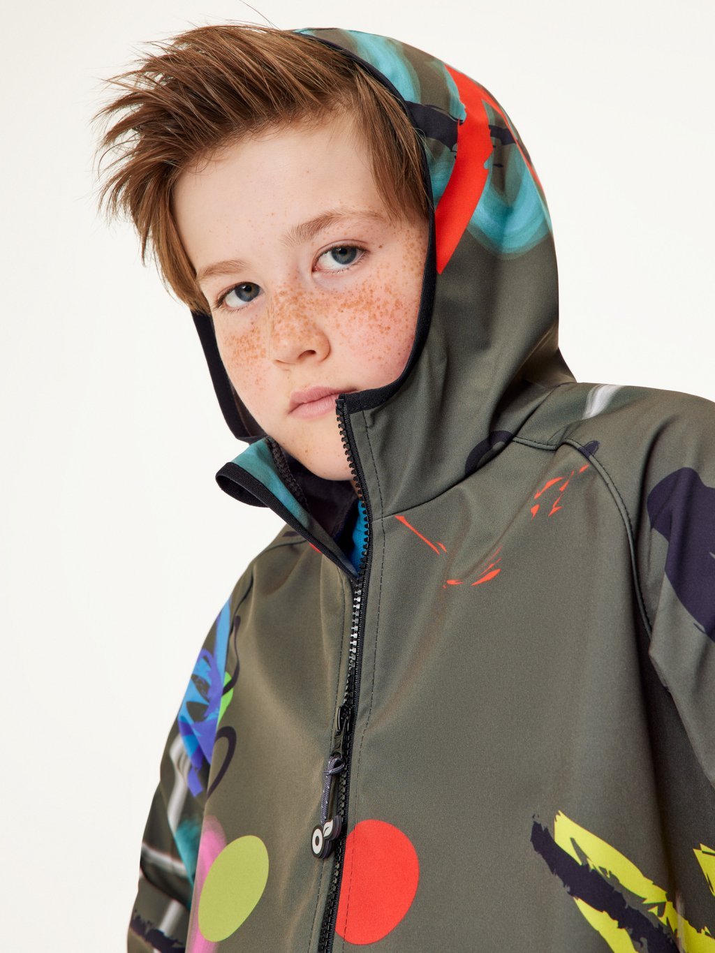 - hlavný materiál, potlač (softshell): rub, líc: 100% polyester, membrána: 100% polyuretan