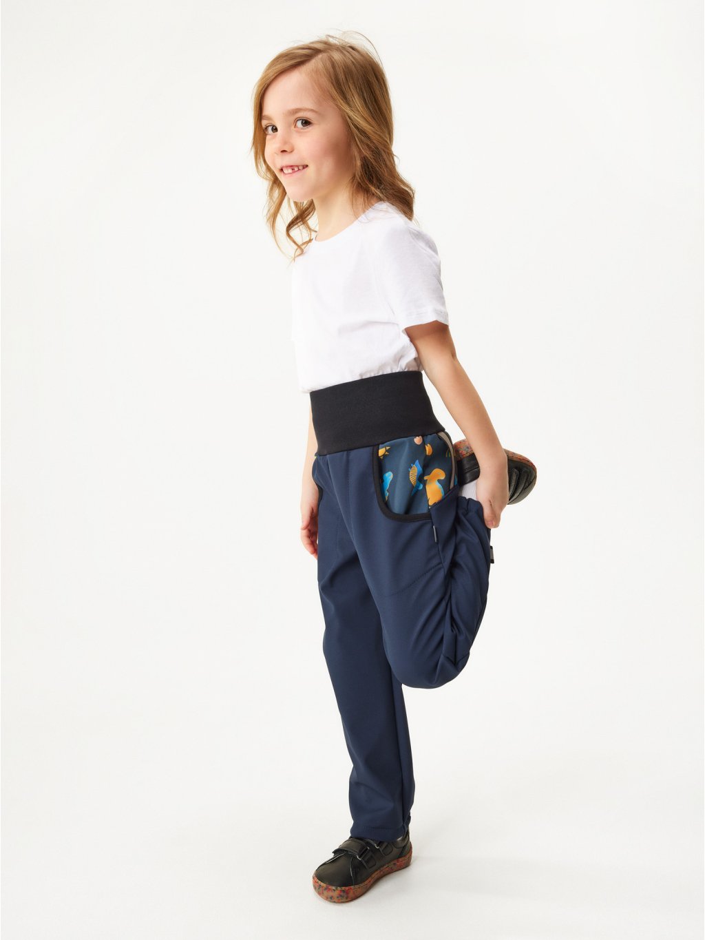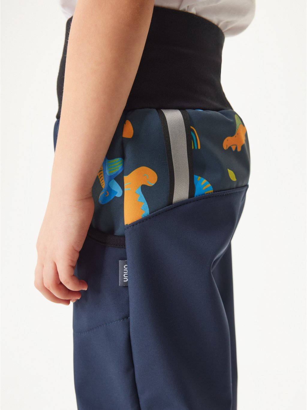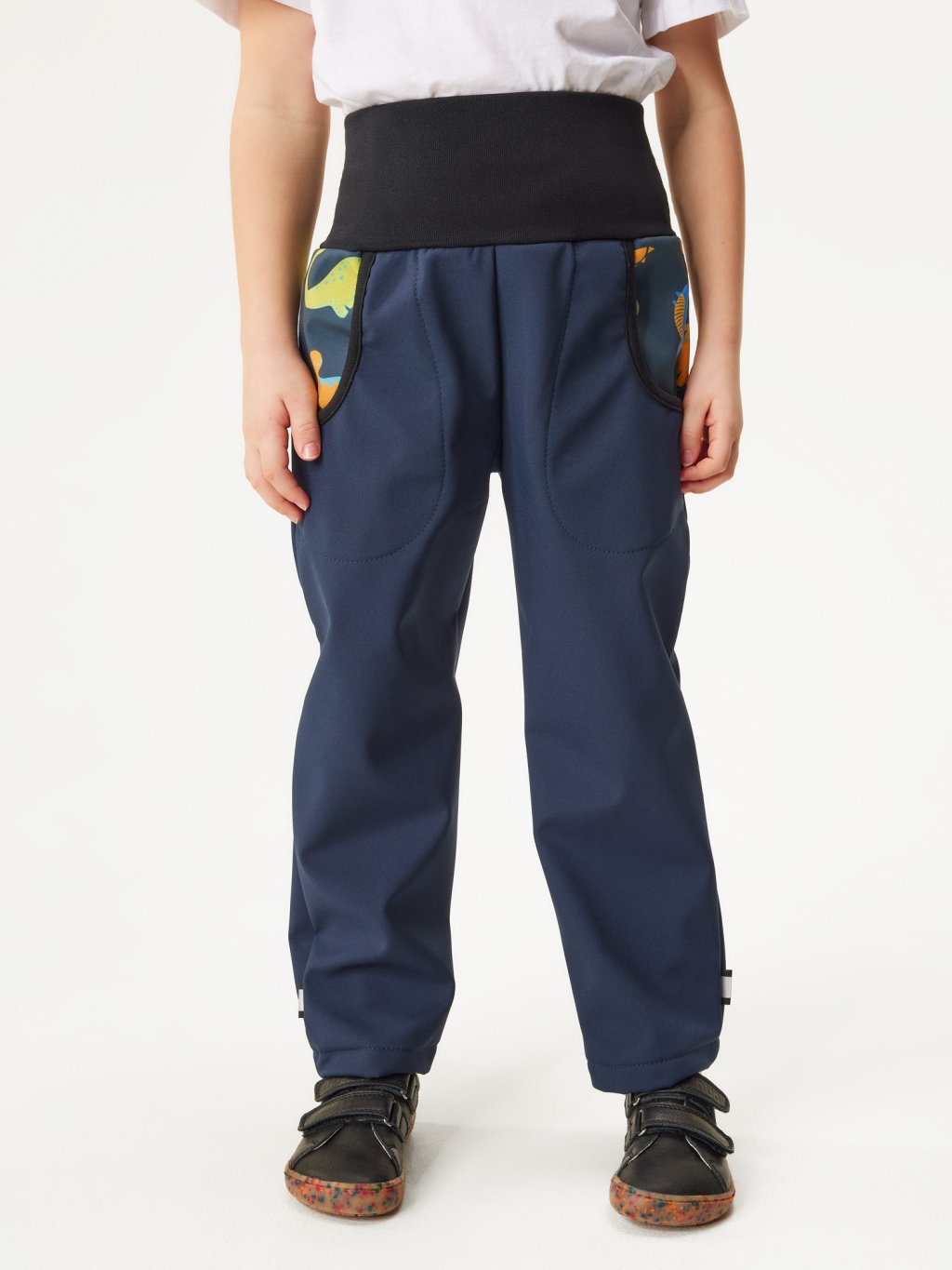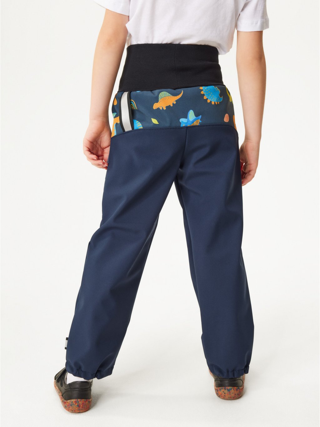 Detské softshellové nohavice s fleecom Basic, Tm. Modročierna, Dinosaury